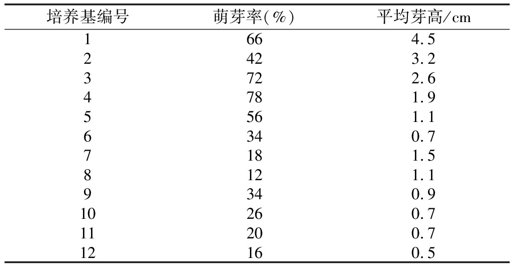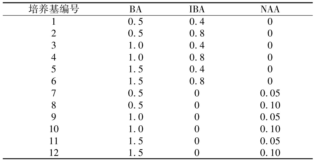 以MS為基本培養(yǎng)基,添加不同質(zhì)量濃度的激素(BA、IBA及NAA)配制12個配方的誘導(dǎo)培養(yǎng)基(表1)。在無菌環(huán)境中將消毒后的外植體切取腋芽,接種于誘導(dǎo)培養(yǎng)基上,每個配方接種50瓶,每瓶1個外植體,20d后統(tǒng)計其萌芽率,40d后統(tǒng)計腋芽生長高度。