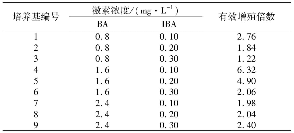 待腋芽長到1.0cm以上時,將其從基部剪開,剪成1.0~2.0cm的單株小芽,轉(zhuǎn)接到以MS為基本培養(yǎng)基,添加不同質(zhì)量濃度的激素(BA、IBA)配制的9個配方的增殖培養(yǎng)基上(表2)。每個組合接種50瓶,每瓶1個嫩芽,40d后統(tǒng)計其增殖率。
