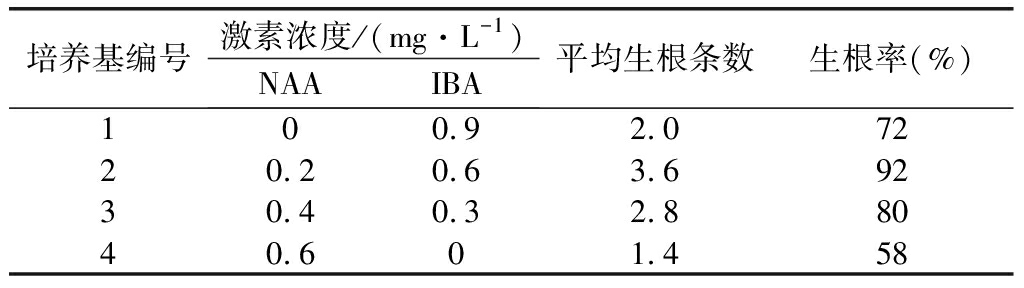 剪取3 cm以上的健壯增殖芽,接種到以1/2 MS為基本培養(yǎng)基,添加不同質(zhì)量濃度的激素(NAA、IBA)配制的4個配方的生根培養(yǎng)基上(表3)進(jìn)行生根培養(yǎng)。每個處理接種10瓶,每瓶接種5株試管苗。接種30d后統(tǒng)計生根率及根長。