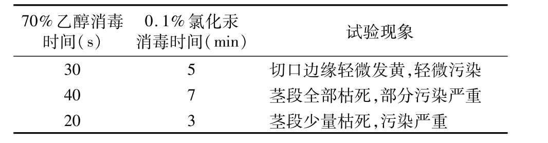 從表2可以看出,70%乙醇30 s、0.1%氯化汞5min的消毒效果佳。氯化汞本身是劇毒品,盡管使用時(shí)稀釋到很低的濃度,對于植物細(xì)胞來說還是有很大傷害,所以其清洗時(shí)間不宜過久,但時(shí)間過短又達(dá)不到消毒的效果。每次氯化汞消毒完畢,要用無菌水沖洗5次左右,保證外植體清洗干凈。