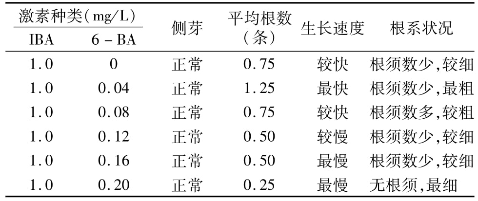 在IBA濃度為1.0 mg/L、6-BA濃度為0~0.20 mg/L時(shí)均有生根現(xiàn)象發(fā)生,生根狀況佳的濃度配比是IBA 1.0 mg/L、6-BA 0.04 mg/L(表4)。在此生根條件下,所有節(jié)段均可產(chǎn)生側(cè)芽,并可在側(cè)芽生出15 d左右出現(xiàn)生根現(xiàn)象,即在這個(gè)濃度配比下,外植體均是先分化長出側(cè)芽,然后在側(cè)芽上長出新根。